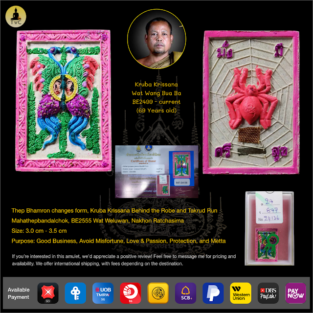 In B.E. 2555 (2012), Kruba Krissana Intawanno of Wat Weluwan, Nakhon Ratchasima, initiated the creation of Thep Bhamron Changes Form Amulet and Takrud Run Mahathepbandalchok to channel divine blessings, fortune, and spiritual transformation. These sacred objects were intended to: